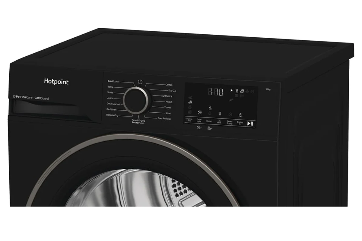 Dry your clothes with effortless style, thanks to this sleek black Hotpoint heat pump tumble dryer. With an 8kg drum capacity, it’s great for busy households with plenty of washing to get through. Heat Pump technology delivers outstanding drying with up to 77% less energy use*. By keeping air temperatures lower inside the drum, it gently cares for your favourite clothes while helping to reduce your energy bills. When you need a gentle cycle, DelicateDry protects fabrics and prevents shrinking – so they stay looking just as good, wash after wash. If you’ve got furry family members, the PetHairCare cycle is for you! It helps lift hair from clothes with a gentle burst of steam and traps it in the filter – keeping laundry fresh, clean, and hair-free. There's only one Easy Clean Filter too, keeping dryer maintenance simple and easy to access in the door. And if you're short on indoor space, the ColdGaurd programme is designed to work efficiently in temperatures as low as 0°C, making it a great fit for garages and outbuildings.