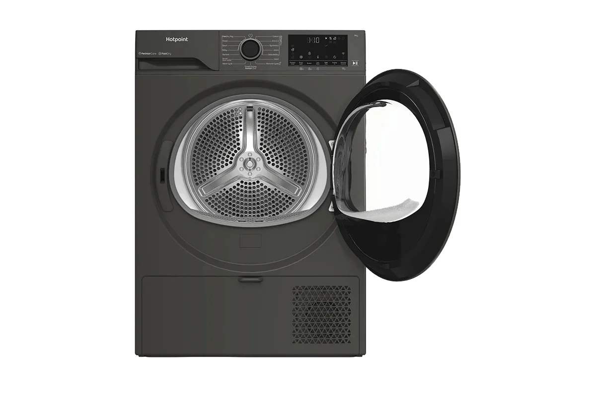 Look after your family's clothes with this Hotpoint FabricCare tumble dryer. Featuring a stylish grey finish and roomy 9kg drum, itās made for busy family life ā handling everything from everyday outfits to big weekend loads with ease. Thanks to Heat Pump technology, clothes are dried gently at lower temperatures, helping to protect fabrics and cut down on energy use by up to 77%. Need the school uniform or your favourite outfit fast? The FastDry function dries up to 5kg of laundry in just one hour. Got pets in the family? PetHairCare uses a burst of steam to help lift hair from clothes so they come out fresh and hair-free. The ColdGaurd programme is designed to work efficiently in temperatures as low as 0°C, allowing you to place your dryer in garages and outbuildings when space in the kitchen is limited. With the Easy Clean Filter in the door and smart control via the HomeWhiz app, staying on top of laundry has never been easier. Compared to condenser tumble dryers of B energy class.