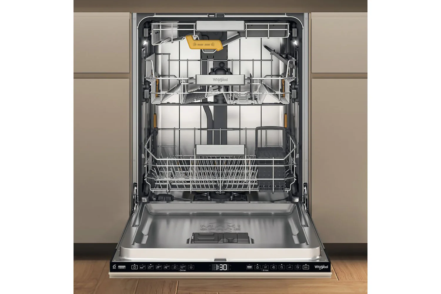 Load it all and think less with the Whirlpool W8I HF58 TU UK built in dishwasher. This 14 place setting capacity model features our most intuitive solution for effortless loading thanks to the unique SpaceClean 3rd rack. The deeper 3rd rack with powerful integrated water jets* allows you to load even full size bowls, glasses and mugs in the rack itself. No matter what the occasion, you'll find room for everything thanks to the Maxi Space tub, which offers 10%** more usable space within the dishwasher. The efficient B energy rated dishwasher, which uses just 9.5 litre of water with every load, also includes 6th Sense technology to automatically senses how dirty the dishes are and adapt the cycle time and water pressure accordingly. This technology ensures brilliant cleaning performance with up to 40%** savings in water and energy. *Based on the volume calculated among top 5 leading brands **vs. Whirlpool dishwasher models with standard tub ***Results referred to the auto mixed program. Different levels of savings reached on the other auto cycles. Tested internally comparing least intensive and most intensive execution of the auto cycle